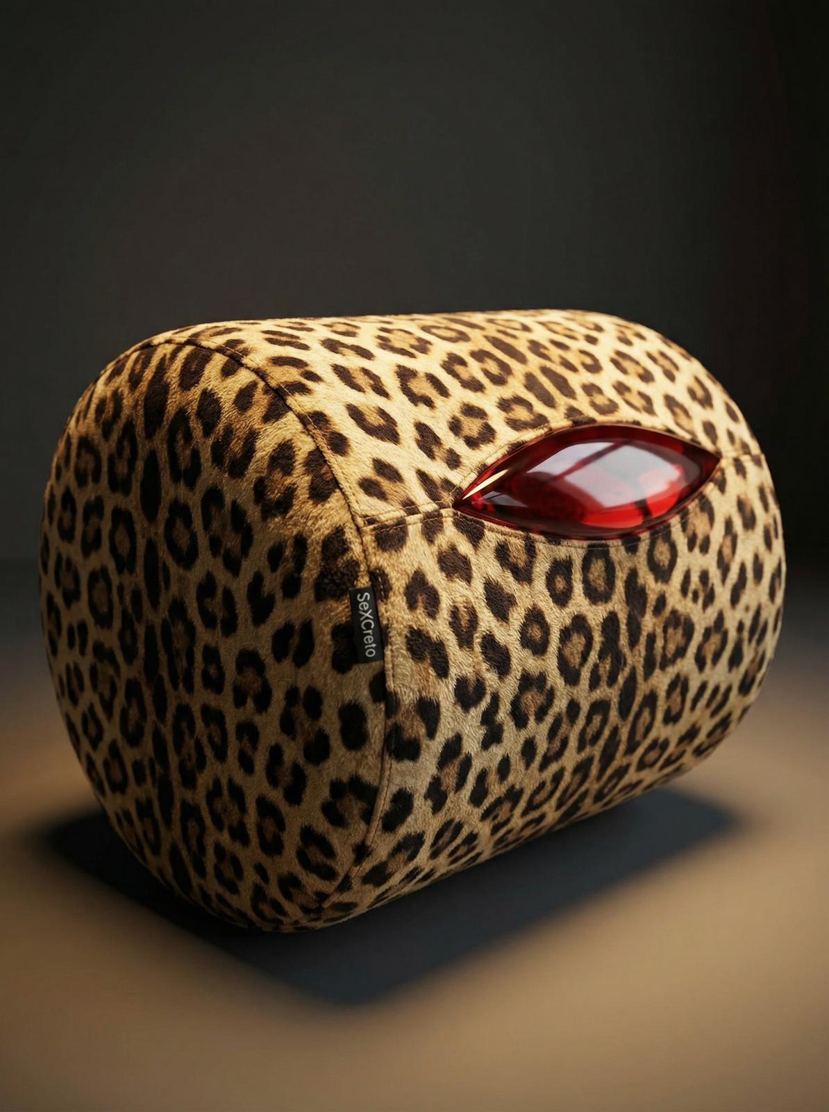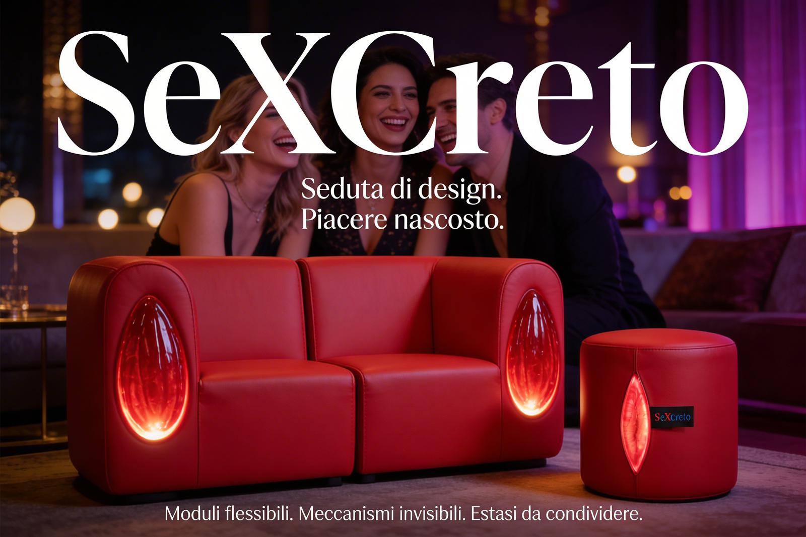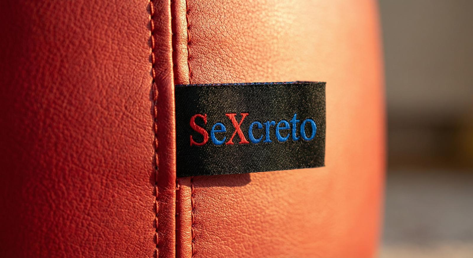 SeXCreto is available in premium red eco-leather, as well as in leopard and tiger print variants, each with a signature embossed brand label sewn into the upholstery.