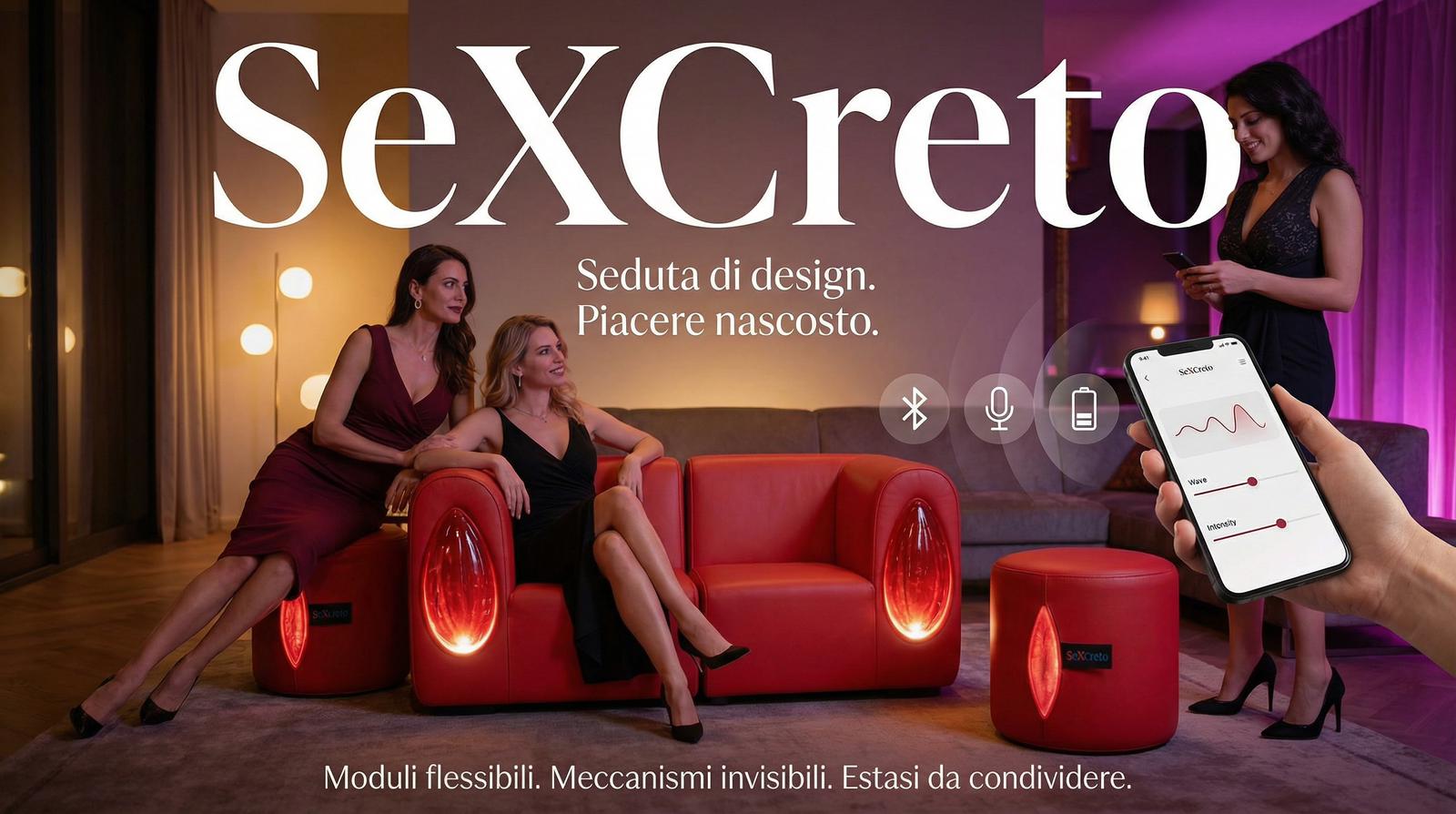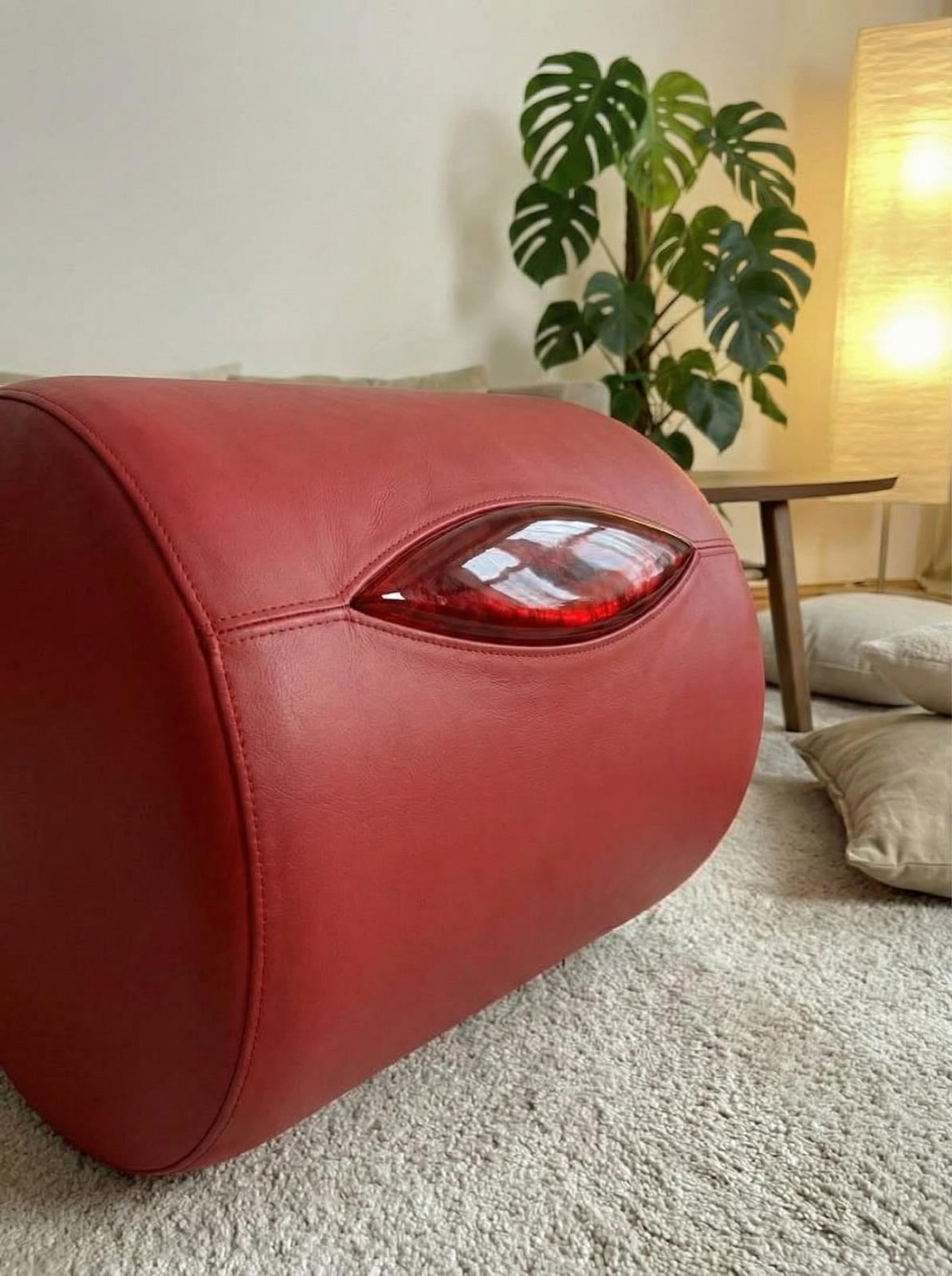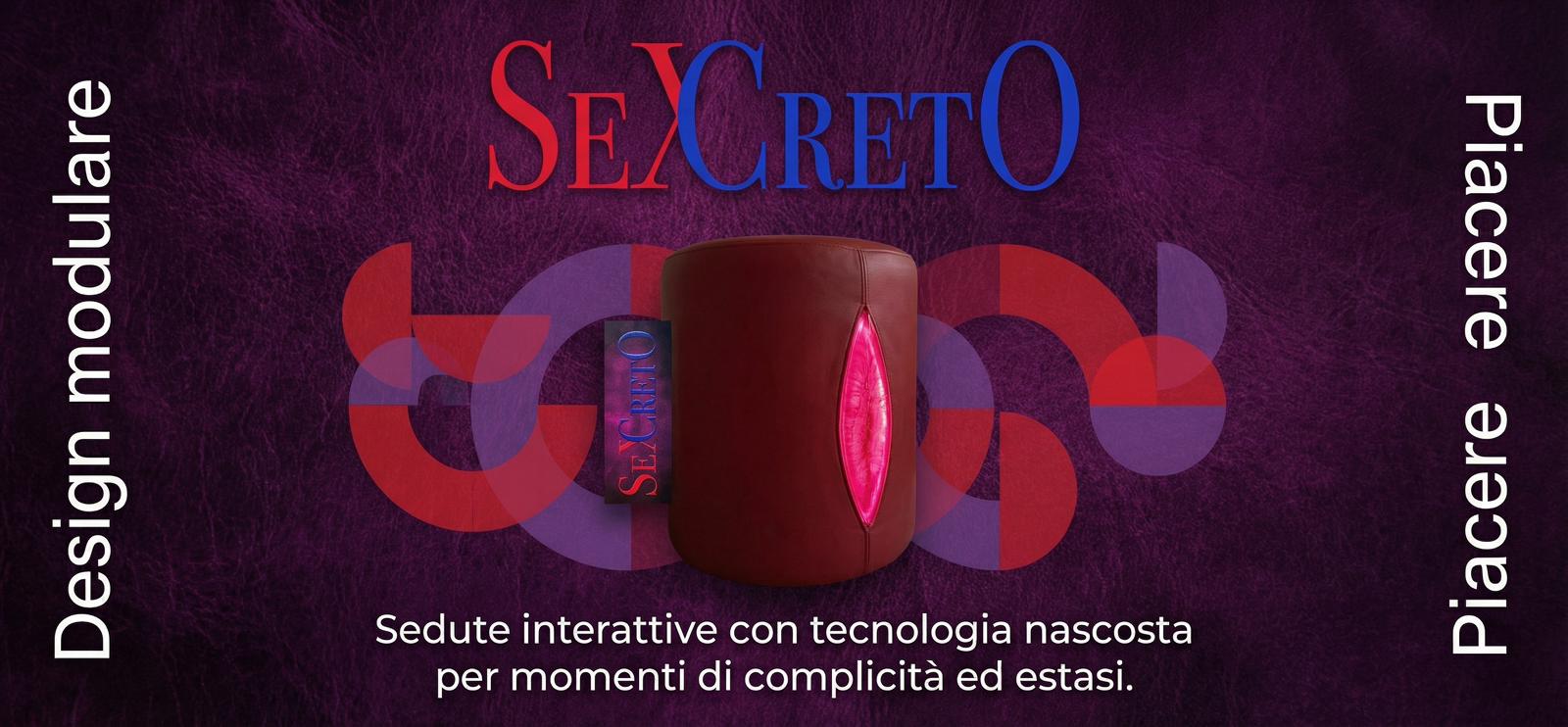 SeXCreto is available in premium red eco-leather, as well as in leopard and tiger print variants, each with a signature embossed brand label sewn into the upholstery.