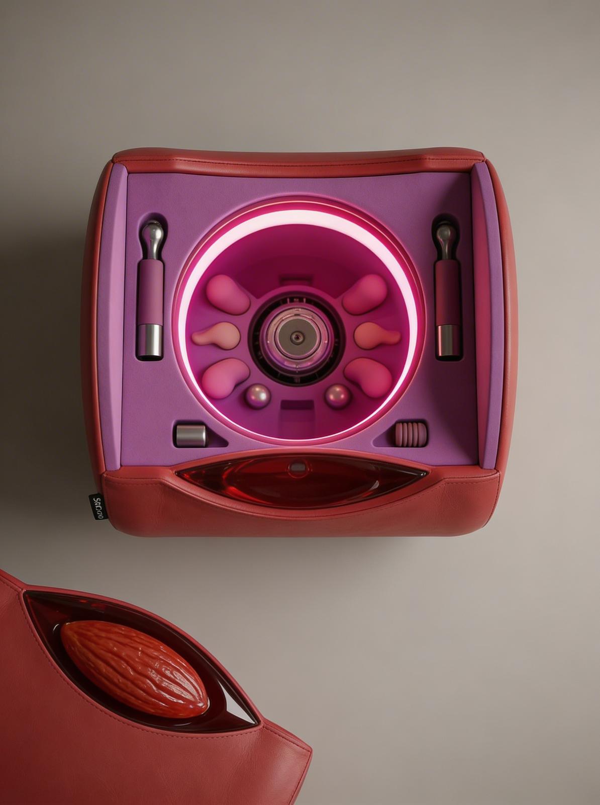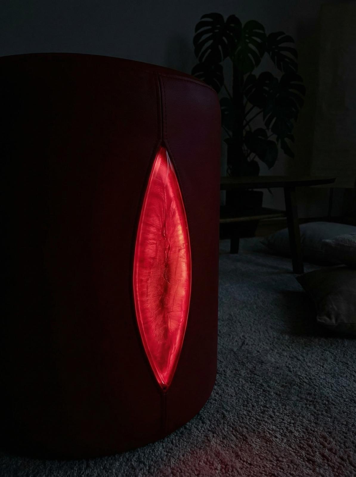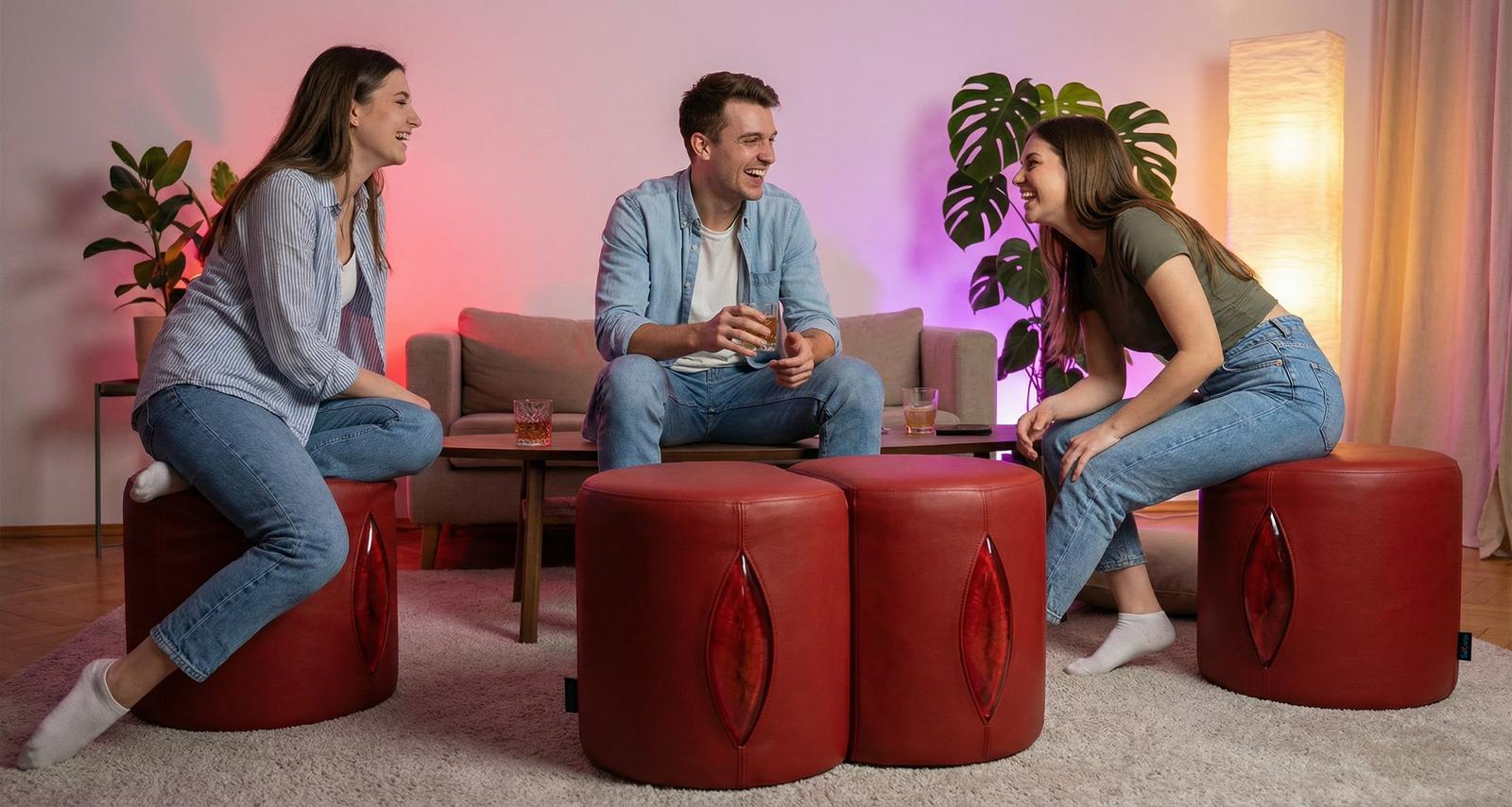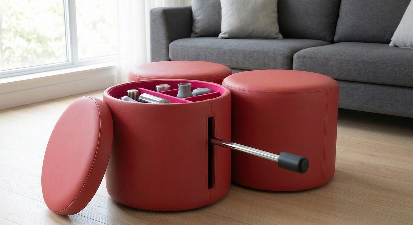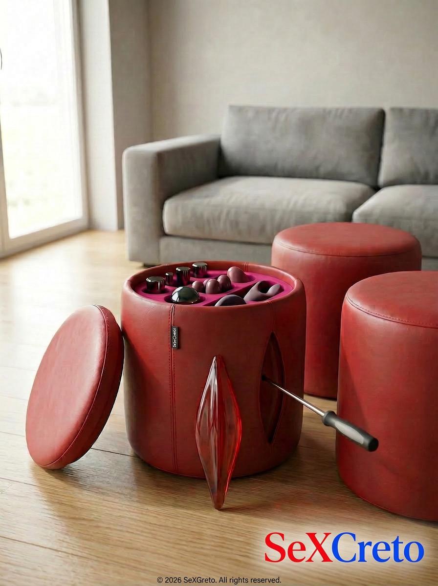 Inside one of the three poufs, behind a magnetically sealed lid that doubles as an accessory compartment, lies a fully concealed, dismountable sex machine. The mechanism remains completely invisible when not in use: the lid closes flush, the surface becomes a seat again, and the object reverts to pure design.